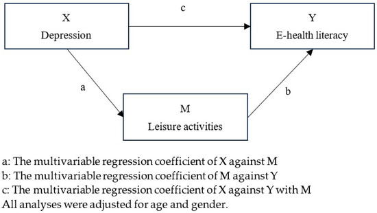 We used multivariable linear regression to analyze the main effect of depression and leisure activities on e-health literacy adjusted for gender and age (RQ1,2). Mediation analysis was performed based on Baron and Kenny [38] with multivariable linear regression (RQ3). Figure 1 shows the mediation analysis model. The mediation model is established if the following three conditions are met: (1) Depression is significantly associated with e-health literacy. (2) Depression is significantly associated with leisure activities. (3) When considering the associations of both depression and leisure activities with e-health literacy, the mediator, leisure activities, is significantly associated with e-health literacy, and the association between depression and e-health literacy either becomes non-significant or is reduced in strength compared to the direct association found in condition 1. In this mediation model, multivariate regression adjusted for age and gender was conducted. The mediation proportion (MP), defined as the dimensionless proportion of the effect of the independent variable on the dependent variable that is mediated through the mediator, was calculated following a previous study [39]. Additionally, we calculated point estimates and bias-corrected 95% confidence intervals for indirect effects using the bootstrap method with a sample size of 2000.