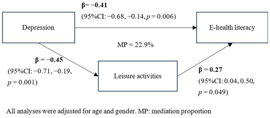 Leisure activities provide physical and cognitive stimulation, which are beneficial for enhancing the overall health of older adults [29,30]. Additionally, leisure activities are associated with the maintenance of social networks [31]. Leisure activities represent a broad concept, encompassing both social and solitary activities, such as watching movies or gardening [31]. Social networks are positively associated with e-health literacy in older adults [19]. Since leisure activities are an important component of social networks, they may also contribute to improving e-health literacy. Moreover, leisure activities are influenced by psychological factors, including depression. However, to our knowledge, the mediation effect of leisure activities between depression and e-health literacy has not been identified.