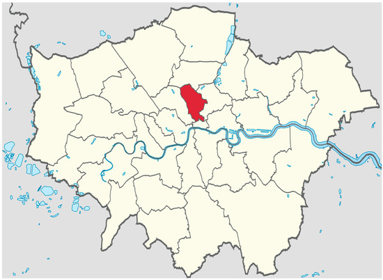 The 33 boroughs of Greater London Authority, with the London Borough of Islington highlighted in red (Source—https://upload.wikimedia.org/wikipedia/commons/4/46/Islington_in_Greater_London.svg, accessed on 21 February 2025).