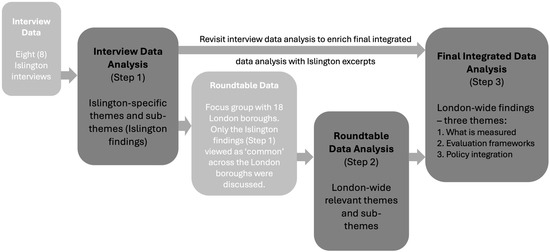 Second, the analysis of the focus group (roundtable) data also employed a manual thematic analysis approach consistent with that used for the interviews. In contrast to the interviews, the roundtable discussions created a more dynamic environment, allowing participants to debate issues, expand on topics and share both collective insights and personal examples from their respective boroughs. This process provided an opportunity to agree on themes and sub-themes developed from the interview data that resonated with or were common across London boroughs and develop/refine those further by incorporating perspectives from participants across various boroughs. The roundtable data analysis was also reviewed and questioned in an open discussion between two researchers, resulting in the final roundtable data analysis (Step 2).