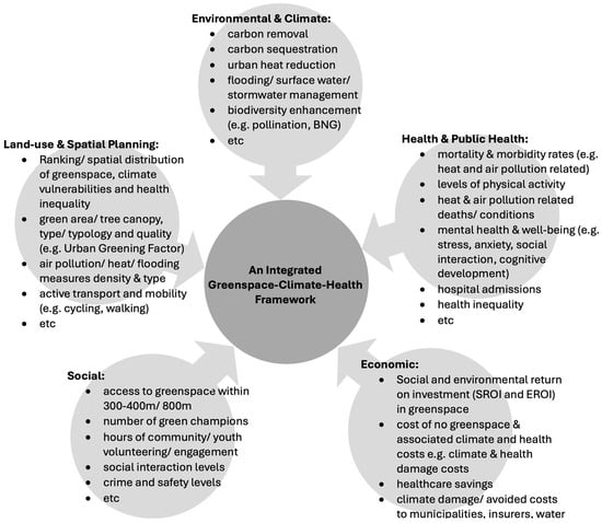 Despite many cities adopting sustainability, climate or health policy and/or monitoring frameworks, an integrated greenspace–climate–health policy framework for ‘city action’, supported by indicators that capture multiple benefits, is currently lacking in London and, to the best of our knowledge, elsewhere. Integration can be achieved by leveraging advanced methodologies, such as remote sensing technologies, geospatial analysis and epidemiological survey data, and datasets can be combined through machine learning and GIS-based spatial analysis. Such a framework could guide urban decision-making processes and prioritise intervention and target investment but also enhance urban planning strategies, ensuring that greenspaces are equitably distributed and optimally designed to support environmental sustainability and public health. More importantly, it should draw on an interdisciplinary approach, combining environmental science, urban planning, public health and social policy perspectives, among others [24].