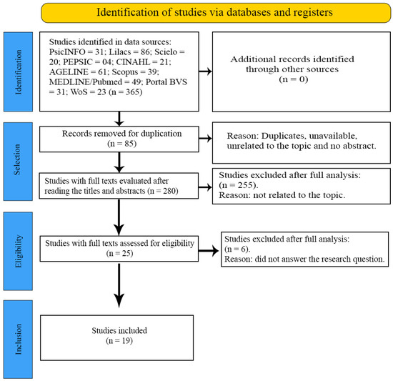 A total of 365 potentially eligible studies were retrieved (PsicINFO = 31; Lilacs = 86; Scielo = 20; PEPSIC = 04; CINAHL = 21; AGELINE = 61; Scopus = 39; MEDLINE/Pubmed = 49; Portal BVS = 31; WoS = 23), and 85 duplicate publications detected by Endnote Web were removed. A total of 280 articles were selected for the title and abstract reading stage, of which 25 were eligible. Of these, 6 articles were excluded because they were inconsistent with the study’s objectives and 19 were selected to make up the sample because they answered the guiding question and were suitable for the purpose of this research. Figure 1 shows the results using the flow diagram of the Preferred Reporting Items for Systematic Reviews and Meta-analyses (PRISMA-ScR) extension for scoping review.