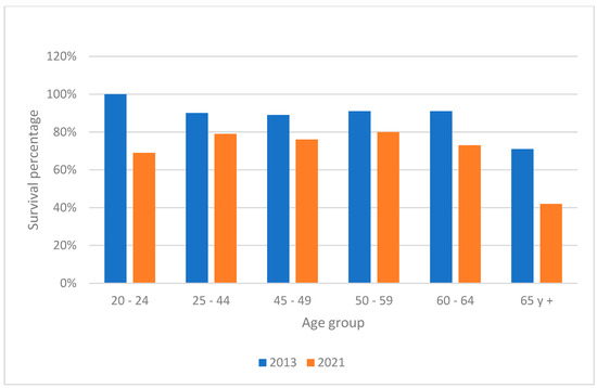Survival was calculated by subtracting the number of cases of deaths from the number of new cases of the disease (incidence). The survival percentage was calculated by group and age, using data from the years 2013 and 2021, the first and last year of the analysis period. A secondary analysis was also performed using the cases of deaths reported by the Global Burden of Disease Study.