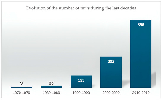 Every decade, the number of published documents increased. The greatest increase occurred in the decade from 1990 to 1999 compared to the previous decade, with approximately six times more publications. In the rest of the decades, the increase doubled from one to the other.