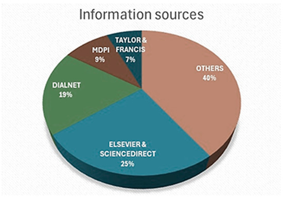The located articles were identified in the following information sources, ordered by number of articles found: Elsevier and ScienceDirect, Dialnet, MDPI, Taylor & Francis, and other sources. Elsevier, with its ScienceDirect search engine, stands out with 25% of the information collected for the study, followed by Dialnet, a multidisciplinary bibliographic search engine for Spanish-speaking scientific texts, with 19%. Figure 3 shows the main information sources identified in this study.
