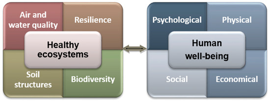 Relationship between healthy ecosystems and human well-being. Prepared by the authors based on the publication “Ecosystems and Human Well-being” (WHO, 2005) and other sources [48].