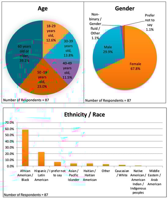 Ninety-four surveys were completed, but three of these were test surveys by the co-authors, leaving ninety-one surveys for data analysis, a 21% response rate. The complete data are provided in the Supplementary Material. Not every question received ninety-one responses, because some patients chose not to respond to certain questions and because seven respondents were not allowed to answer some questions because they stated that they had not read the educational items. The demographics of the respondents are shown in Figure 1. They included 59 females (67.8%), 26 males (29.9%), 1 gender non-binary person (1.1%), and 1 person who preferred not to say (1.1%). Eleven respondents were 18–29 years old (12.6%), twelve were 30–39 (13.8%), ten were 40–49 (11.5%), twenty were 50–59 (23.0%), and thirty-four were 60 years old or older (39.1%). Fifty-one of the respondents (58.6%) identified as African American, twenty (23.0%) as Hispanic or Latin American, four (4.6%) as Haitian or Haitian American, four (4.6%) as Asian or Pacific Islander, three (3.4%) as Other, two (2.3%) as Caucasian or White, and one (1.1%) as Native American, American Indian, or Indigenous Peoples. Six (6.9%) chose not to disclose their racial or ethnic background. Eleven percent of surveys were completed in Spanish.
