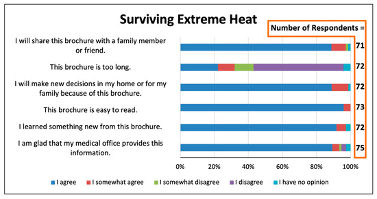 Seventy-six respondents indicated that they read the one-page flier, “Heat Stress Overview” (Figure 4). The vast majority agreed that they found this item easy to read, that the handout will prompt them to make new decisions in their home or in their family, that they learned something new, and that they will share the handout with family and friends. Only 18% agreed with the statement that “that the handout is too long”, a smaller figure than was the case for the six-page brochure. Notably, more that 86% agreed with the statement “I am glad that my medical office provides this information”.