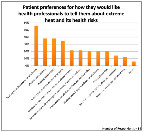 The survey included one question asking patients how they would like their medical professionals to tell them about extreme heat and its health risks. This question offered ten possible teaching methods and allowed respondents to choose as many as they wished (Figure 6).