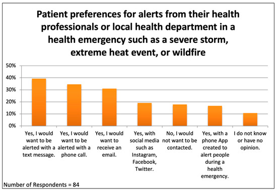 The survey asked patients how they would like to be contacted during a “health emergency such as a severe storm, extreme heat event, or wildfire”. The respondents could choose as many options as they wished; eighty-four responded to this question (Figure 7). Surprisingly, 17.9% told us that they would not want to be contacted or had no opinion. The most popular method of communication was text messaging, chosen by 39.3% of respondents, followed by “a phone call” (34.5%), an email message (31%), using social media (19%), and using “an app created to alert people during a health emergency” (16.7%). Respondents were not asked to rank their choices, but it appears that no single modality would be effective for reaching everyone at risk. It is difficult to exclude a Primary Effect Cognitive Bias, a tendency for people to choose the first few items in a list, but the order of presentation of the options in the survey questions was not the order depicted in Figure 6 and Figure 7 (see Supplementary Materials).