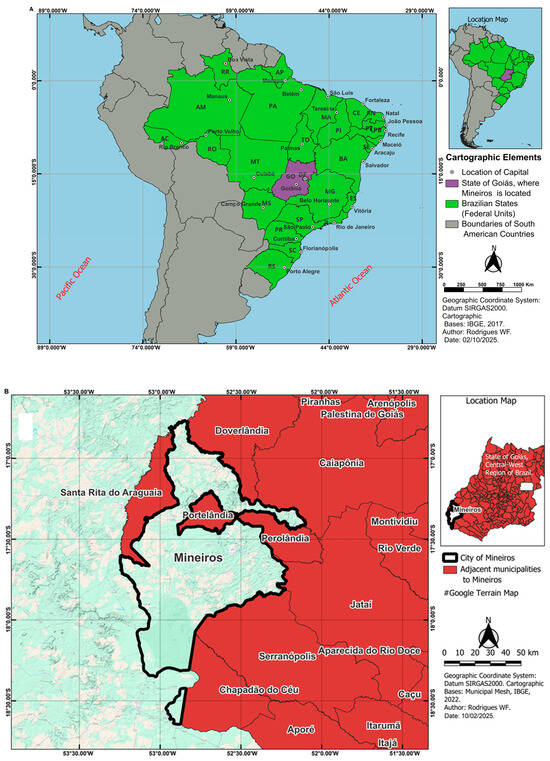 Geospatial representation of the study area. Panel (A) illustrates the geographical positioning of the state of Goiás within Brazil, South America, and its proximity to the Atlantic and Pacific Oceans. The scale bar ranges from 0 to 1000 km, with intervals of 250 km. Goiás is highlighted in purple, while the other Brazilian states are depicted in green. Neighboring countries that share a border with Brazil are represented in gray. The grid was inserted using degrees, minutes, and suffix notation. Panel (B) presents a detailed delineation of the target municipality, Mineiros, within the state of Goiás. The municipality is circled in black, while other cities included in the study are filled in red. The scale bar ranges from 0 to 50 km, with intervals of 10 km. Official cartographic coordinates were obtained from the Brazilian Institute of Geography and Statistics (IBGE) and referenced to the SIRGAS 2000 data. The dataset for Panel (A) corresponds to 2017, while for Panel (B), data from 2022 were used. The map was generated using QGIS version 3.34.15 (https://qgis.org/download/, accessed on 10 February 2025).