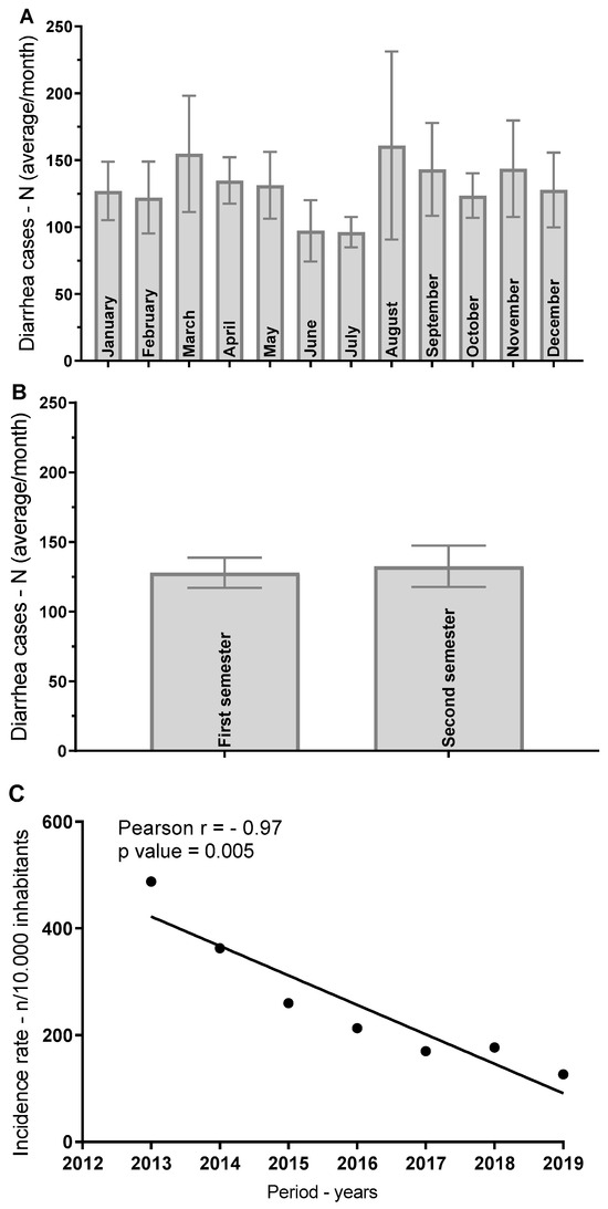 The incidence and temporal distribution of diarrhea cases in the municipality of Southwestern Goiás were analyzed monthly and biannually from 2013 to 2019. Statistical analyses were performed to evaluate the seasonal trends and the relationship between the progression of cases over the years (Figure 4).