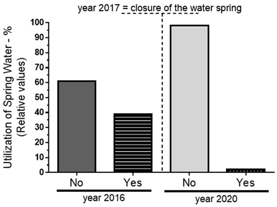 Change in water consumption from springs between 2016 and 2020. The data, obtained through a questionnaire, show a significant reduction in the percentage of respondents using spring water from 2016 (39%) to 2020 (2%), reflecting a major shift in consumption behavior following the closure of a key spring water collection site in 2017. The significance level used for the analysis was p < 0.05.