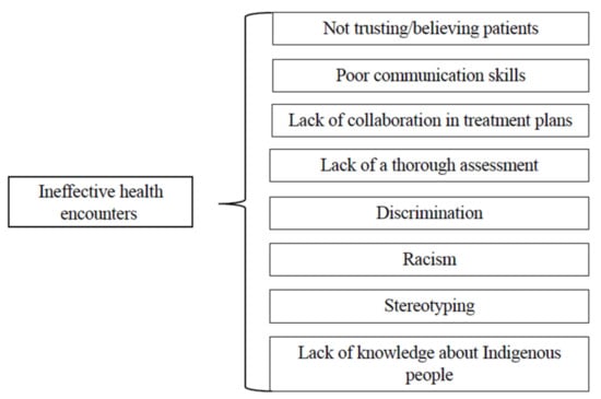 This theme is characterized by health encounters that were unwanted and resulted in negative outcomes. Encounters were described by participants as poor quality, and they felt providers were biased against them as Indigenous patients. Participants noted that ineffective health encounters included interactions in which providers did not explain health issues well, did not listen to or respect the patient and patient autonomy in decision-making, and appeared to lack knowledge about or interest in the patients’ lives and communities (Figure 1).