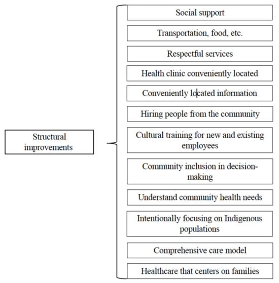 Participants highlighted the importance of addressing the cultural needs of Indigenous people and the provision of comprehensive care and social support. Some of these included straightforward decisions such as having transportation arranged, food available, or the health clinic conveniently located (Figure 5). Others involved broader practices such as the intentionality of choosing an Indigenous patient population and locating the clinic in the heart of an Indigenous community and neighborhood. Participants requested that healthcare centers, on an individual and community level, listen to patients’ needs and be an active member of their healthcare treatment team.