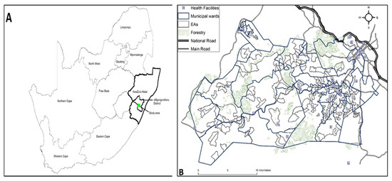 Figure 1A,B below depict the location of the study area within uMgungundlovu District and the location of the two sub-districts of KwaZulu-Natal Province, namely, Vulindlela (western part) and the Greater Edendale (eastern part), respectively.