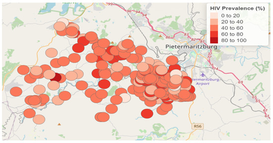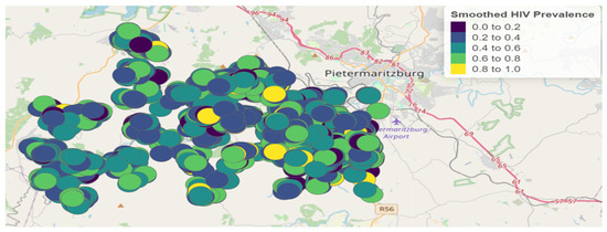 - Tomita, A.; Vandormael, A.; Cuadros, D.; Di Minin, E.; Heikinheimo, V.; Tanser, F.; Slotow, R. Spatial clustering of HIV prevalence in KwaZulu-Natal, South Africa: Applying Bayesian spatial modeling to a hyperendemic epidemic. Int. J. Health Geogr. 2020, 19, 1–12. [Google Scholar]
