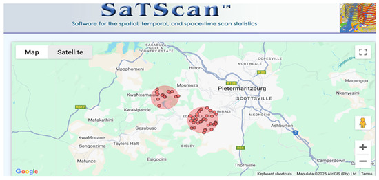 As shown in Table 2, both Moran’s I and Geary’s C indicate significant and strong positive spatial autocorrelation in HIV prevalence. These results confirm spatial heterogeneity, suggesting that HIV prevalence is not randomly distributed but influenced by underlying spatial processes or risk factors in uMgungundlovu District. However, while Moran’s I and Geary’s C detect spatial autocorrelation, they do not differentiate hotspots from cold spots. To address this, Kulldorff’s spatial scan statistics were applied, identifying two clusters of HIV prevalence. The spatial distribution of these clusters is visualised in Figure 3.