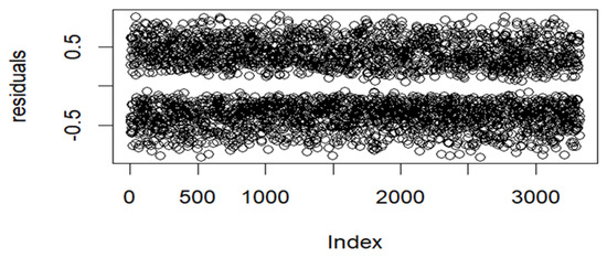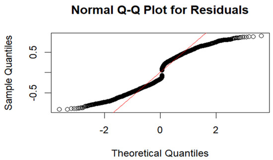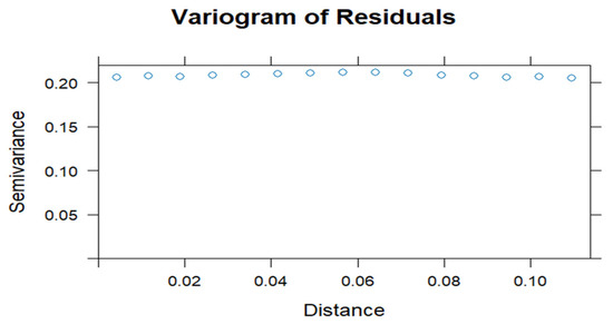 After selecting the best-fitting model, we assessed its adequacy using residual plots and normal Q–Q plots. A well-fitted model should have residuals symmetrically distributed around zero, with no clear pattern or trend and constant variance [41,42,43]. Deviations from normality in the Q–Q plot suggest that residuals do not follow a normal distribution. We also examined spatial autocorrelation in residuals using Moran’s I statistic, Geary’s C statistic, and the variogram plot to verify whether the spatial structure was adequately captured. High spatial autocorrelation in residuals indicates the model failed to fully account for spatial dependencies [44,45]. Significant Moran’s I and Geary’s C values suggest poor model fit. Increasing semi-variance with distance indicates spatial autocorrelation, suggesting an inadequate model. Flat variogram suggests spatially uncorrelated residuals, indicating a well-fitted model [44,46]. Additionally, posterior density plots were examined for model validity, reliability, and stability. A smooth, unimodal density plot indicates a well-fitting model, while a multimodal plot may suggest model ambiguity or data issues [17].