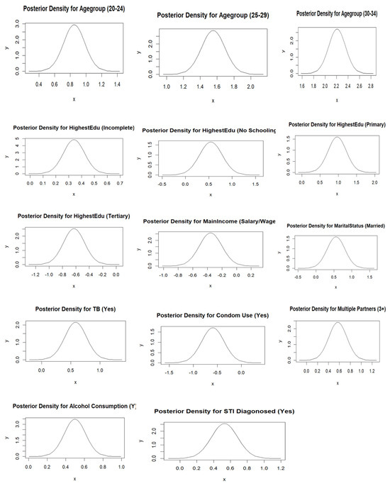 Bayesian logistic regression is a powerful method for modelling binary outcomes, such as disease presence, by estimating posterior distributions of regression parameters. This approach combines prior beliefs with observed data, resulting in posterior distributions that reflect both sources of information [17,29]. In this study, the Bayesian spatial logistic regression model accounts for both individual-level factors (e.g., age, education, and behavioural risk factors) and spatial dependencies through a structured random-effects component. The spatial effect is modelled using a structured spatial component, which captures spatial autocorrelation by borrowing strength from neighbouring areas. This approach ensures that unobserved neighbourhood-level influences on HIV prevalence, such as healthcare access, socio-economic disparities, and localised prevention efforts, are accounted for beyond the effects of individual-level risk factors alone. The persistence of spatial clustering, even after adjusting for individual factors, suggests that geographic factors contribute independently to HIV risk.