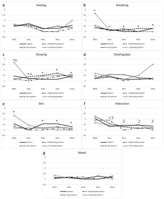 - Bilgin, A.; Wolke, D. Regulatory problems in very preterm and full-term infants over the first 18 months. J. Dev. Behav. Pediatr. 2016, 37, 298–305. [Google Scholar] [CrossRef]