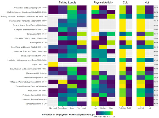 We created an extended exposure matrix for aerosol transmission, talking loudly (four-level exposures), PA (three-level), cold (two-level) and hot (two-level), resulting in 535 COC-based occupations. Overall, we classified over 70% or more occupations as loud or very loud (74.6%); whereas 13.8% were high PA, 18.5% were exposed to cold, and 23.7% were exposed to hot temperatures (Table 1). Moreover, 35 occupations were assigned to the highest exposure categories for all four dimensions, among which 21 (60%) were construction and extraction (construction). When applied to the California workforce 2019 estimates, we found 21.2% worked in very loud occupations, 12.6% worked in high PA occupations, and 15.7% were exposed to cold and 17.8% to hot temperatures.