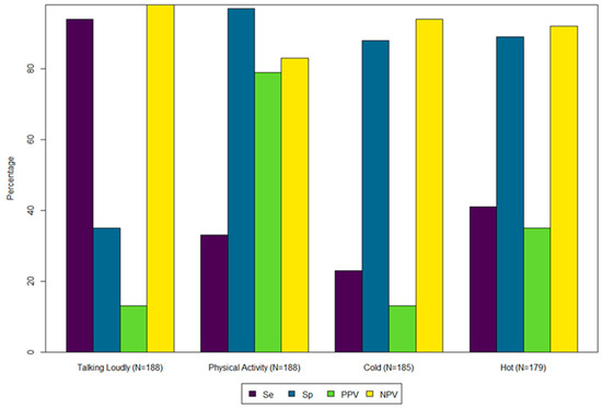 For the 188 occupations we could assign exposures using ORS, we found poor agreement for loud (kappa = 0.0184) and physical activity (kappa = 0.3807). While for the 179 occupations for cold and heat, we also found poor agreement for each (kappa = 0.0781 and kappa = 0.2790, respectively). High Se (>0.80) was obtained for talking loud and high Sp (>0.80) was obtained for high physical activity and cold and hot environments (Figure 2).