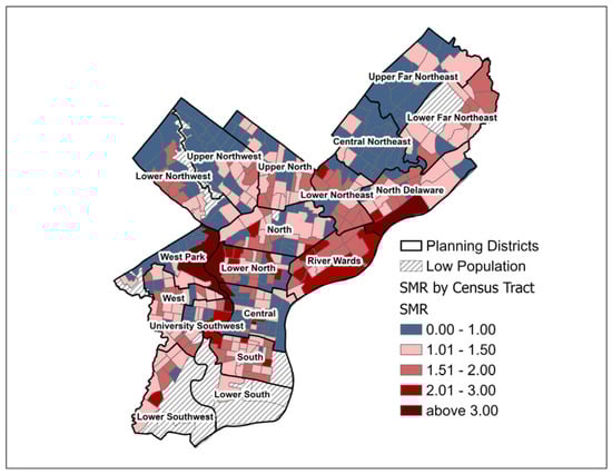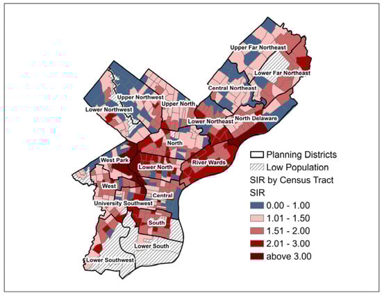 Using indirect age-adjustment methodology, standardized incidence ratios (SIR) and standardized mortality ratios (SMR) were calculated by census tract using the 2010 Census population counts for Philadelphia census tracts and the Surveillance Epidemiology and End Results (SEER) U.S. incidence rates (2013–2017) and U.S. mortality rates (2014–2018) for cancer of the lung and bronchus [,]. Lung cancer age-adjusted SIR and SMR (referred to as SIR and SMR, respectively, for the remainder of this analysis) by Philadelphia census tract were visualized on graduated choropleth maps to assess areas of higher and lower than expected lung cancer burden after the indirect age-adjustment method. As part of the city’s plan for rejuvenation, Philadelphia has been divided into 18 planning districts. These districts contain many neighborhoods, numerous census tracts, and cross zip codes. Planning districts will be used for descriptive purposes in this paper to orient the reader to particular areas of focus.