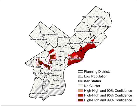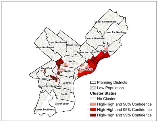 Fifty-five census tracts met both Moran’s I and Getis-Ord Gi* criteria to be classified as part of SIR clusters, and 40 census tracts met the criteria for SMR clusters. For both SIR and SMR, two distinct geographic clusters of high-burden census tracts were apparent: one cluster in the North/Lower North planning districts bordering Fairmount Park, and one cluster spanning parts of the River Wards, Lower Northeast, and North Delaware planning districts (Figure 3 and Figure 4). For SIR only, a third cluster was apparent in the western half of the South Philadelphia planning district.