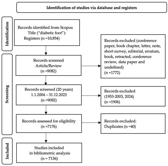 To carry out the bibliographic search, the MeSH term “diabetic foot” [51] was used, and it was executed using quotation marks (“”) in the title field to ensure a better fit to the subject of the data. Only articles and review documents were selected, as these are the ones that mainly receive citations, and any other types of records retrieved were excluded. There was no language restriction. The search was later on limited to the period between 1 January 2004 and 31 December 2023, spanning the last two decades. The year 2024 was not included as the search was conducted on 28 July 2024. The strategy executed was as follows: