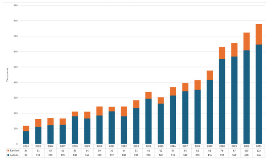 In the 7136 documents analysed, a total of 5956 articles and 1180 reviews were counted; 41.17% of the documents are available in open access, of which 85.70% are articles and 14.30% are reviews.