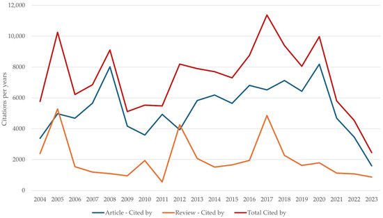 These documents have received a total of 145,688 citations, with the mean and standard deviation being 7284.4 ± 2203.96 citations per year. The distribution of citations received by year and type of document is shown in Figure 3.