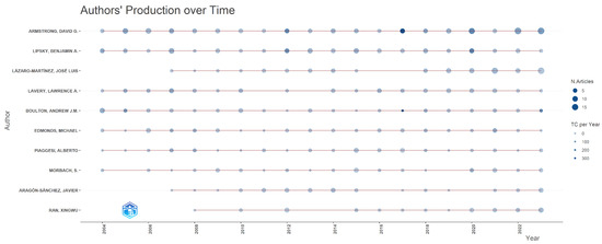 In the sample analysed, Lotka’s Law or the law of author productivity is fulfilled, which says that most scientific knowledge comes from a small group of very productive authors. We counted 237 (0.99%) large producers (authors who have published 10 or more documents), 4861 (20.34%) medium producers (between 2 and 9 documents), and 18,800 (78.66%) small producers or occasional authors who have published a single document. The 10 most prolific authors in the field of diabetic foot are shown in Table 2, and their production over the last two decades analysed is shown in Figure 4.