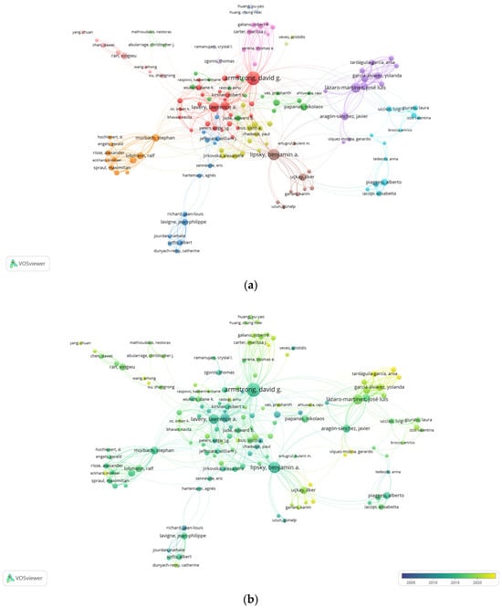 Collaboration networks between authors: (a) collaboration network of authors with 10 or more published documents and a maximum of 10 signatures per article on diabetic foot showing the 14 clusters generated and (b) collaboration network via overlay visualisation representing the production of these authors over time. The colours of the nodes, explained via a colour bar in the corner, show the current production of these authors, with yellow representing the most recent publications and blue representing the less recent ones, throughout the period of analysis. The node size represents the output of each author, and the thickness of the lines indicates the strength of association between authors.