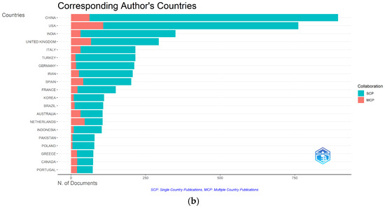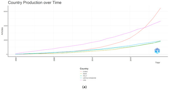 Through the graphs provided by Biblioshiny, we can see in Figure 6 the production over time in the five most productive countries (China; United States; United Kingdom; India; and Italy), where China’s scientific production has spiked in recent years (Figure 6a). The degree of collaboration between the top 20 countries according to the affiliation of the author chosen for correspondence is also showed, differentiating Single-Country Publications (SCPs) from Multiple-Country Publications (MCPs), clearly revealing that the countries with the greatest international collaboration are the United States and the United Kingdom, and the countries with the least collaboration are Pakistan and Poland (Figure 6b).