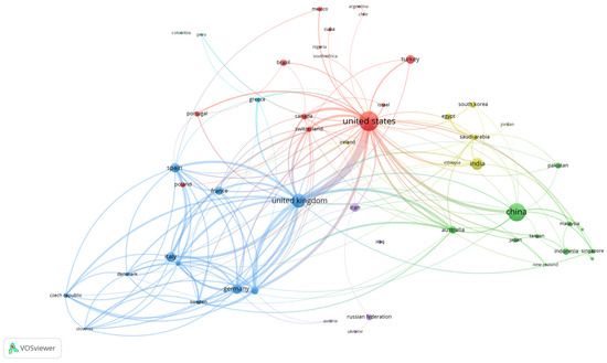 The map of country co-authorships generated through VOSviewer in Figure 7 shows the relationships between the 52 countries with at least 20 publications. These are grouped into six clusters, where it is clearly observed that the most powerful countries are the United States, United Kingdom, and China. Due to the thickness of the lines of union between nodes, the strong relations between the United States and the United Kingdom and between the member countries of the European Union are very well observed.