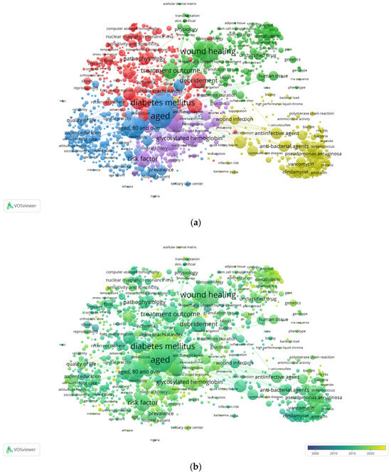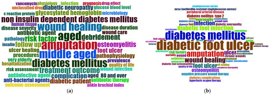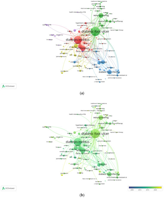 Among the most innovative terms identified in both groups of keywords, in our study, we highlight terms referring to the COVID-19 pandemic; terms related to new technologies such as “artificial intelligence”, “deep learning”, “machine learning”, “convolutional neural network”, and “bioinformatics”; terms referring to genetics and cell biology such as “exome”, “gene ontology”, and “umbilical vein endothelial cell”; terms related to infections and infectious agents such as “diabetic foot osteomyelitis”, “multidrug resistant bacterium”, “staphylococcus aureus infection”, and “microbiome”, and terms related to new therapies such as “platelet-rich plasma”, among others. In the bibliometric study carried out by Deng et al. [33], mentioned above, using the VOSviewer tool, they noted that, within the five groups or lines of research they detected, the one that contained the largest number of most current keywords in the period 2004–2020 was the one related to the investigation of the molecular mechanism of diabetic foot ulcers. And in the study by Zha et al. [18], using the CiteSpace tool, the authors identified 15 keywords that represented the most current lines of research in the period 2007–2018; these were “resistant staphylococcus aureus”, “ulcer”, “expression”, “film”, “revascularization”, “peripheral neuropathy”, “management”, “foot ulceration”, “amputation”, “endothelial cell”, “diabetic foot ulcer”, “randomized controlled trial”, “multicenter”, “infection”, “plantar ulcer”, and “angipars”. Comparing these keywords with those obtained in our results, as the most novel terms in the period 2004–2023, we observe some synonyms and that infections and infectious agents continue to be a hot and current topic for research in the diabetic foot field [18].