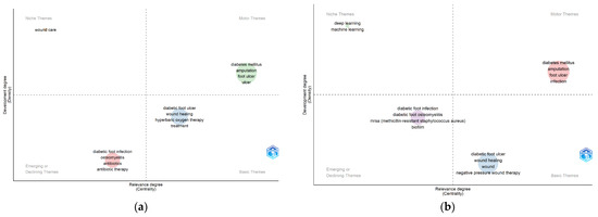 The thematic maps generated try to represent how researchers perceive and communicate the topics of interest in the field of diabetic foot [55]. The thematic evolution that we have identified in the analysis of author keywords evidence that the hottest topics throughout the 20 years of analysis are those related to diabetes mellitus, amputations, ulcers, and diabetic foot infections. As basic topics, the ones which stand out are aspects related to the healing of ulcers with treatments such as hyperbaric oxygen therapy and, more recently, negative pressure wound therapy. Among the emerging topics, we observed that diabetic foot infection, osteomyelitis, and antibiotic treatments stood out, with a major role played by antibiotic resistance. As niche topics, wound care in the first decade and terms related to artificial intelligence such as deep learning and machine learning have gained greater interest by researchers in recent years. The emergence of new technologies associated with artificial intelligence promises to revolutionise diabetic foot care by providing greater precision in diagnosis and in the planning of personalised treatment strategies, taking advantage of advances in medical imaging, biomarker detection, and clinical biomechanics [61].