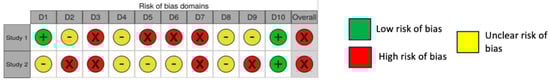 Example of use of SYRCLE (Systematic Review Centre for Laboratory Animal Experimentation) Risk of Bias Tool for Animal Studies, where studies are assessed for risk of bias according to various domains (D1–D10) []: D1: Random sequence generation (selection bias); D2: Baseline characteristics (selection bias); D3: Allocation concealment (selection bias); D4: Random housing (performance bias); D5: Blinding of participants and personnel (performance bias); D6: Random outcome assessment (detection bias); D7: Blinding of outcome assessment (detection bias); D8: Incomplete outcome data (attrition bias); D9: Selective reporting (reporting bias); D10: Other bias.