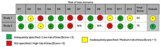 Example of use of QUIN Risk of Bias tool (Quality Assessment Tool For In Vitro Studies) for in vitro human cell studies, where studies are assessed for risk of bias according to various domains (D1–D12) []: D1: Clearly stated aims/objectives; D2: Detailed explanation of sample size calculation; D3: Detailed explanation of sampling technique; D4: Details of comparison group; D5: Detailed explanation of methodology; D6: Operator details; D7: Randomisation; D8: Method of measurement of outcome; D9: Outcome assessor details; D10: Blinding; D11: Statistical analysis; D12: Presentation of results; Final score: = (Total score × 100)/(2 × number of criteria applicable).
