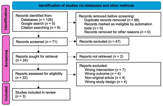 A total of 139 articles were retrieved during the initial database searches, of which 71 unique articles were identified. Following the inclusion criteria, after title and abstract screening, 22 articles remained for full-text assessment. Of these, 19 articles were excluded due to wrong outcomes or no or limited cellular investigation or studies of general health effects (n = 4), wrong study design being uncontrolled or non-experimental (n = 4), non-original articles of systematic reviews (n = 3) or letters to the editor (n = 1), and wrong intervention of other exposure types like secondhand smoke (n = 3), exposure to cigarettes (n = 2), or thirdhand exposure to only the nicotine component of vapes in two studies by Olomu et al. [] and Pozuelos et al. []. These studies were excluded after a final consensus because although they focused on the cellular outcomes of exposure of human cells to nicotine concentrations typically experienced in thirdhand vape contexts, they did not expose the cells to the other chemicals typically present in vapes. Therefore, the results of these studies are not entirely relevant to the aim of this review. Ultimately, a total of three articles on mice models were selected to be included in this systematic review (Figure 3).