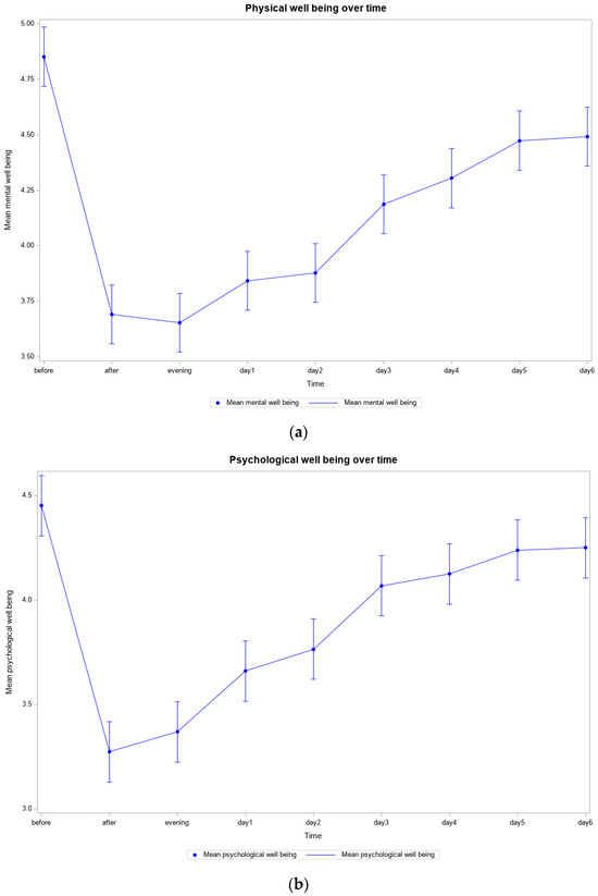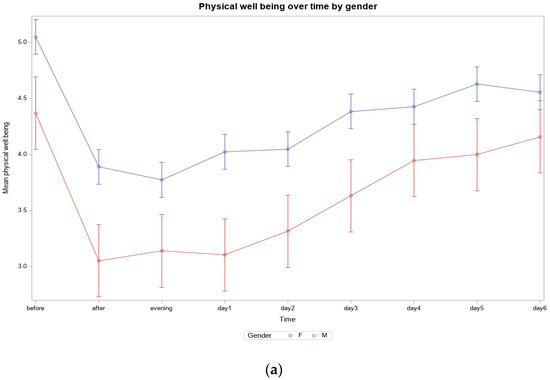 For men, physical well-being improved significantly from 4.36 to 3.14 (p < 0.0001) and remained slightly better than before training, at 3.94, after four days (p = 0.1119). The situation for women was similar, although less marked, with an improvement from 5.04 to 3.77 (p < 0.0001) and a score of 4.42 on day four (p < 0.0001) (Figure S4 and Figure 2a). Psychological well-being was best, with men reporting an average score of 3.63 before training and women starting at 4.72. While the men improved to 2.79 (p = 0.0006), the women improved to 3.56 (p < 0.0001). Both groups had slightly improved scores at the end (men 3.68 (p = 0.85), women 4.43 (p = 0.0008)) (Figure S5 and Figure 2b). Mental well-being followed a similar trajectory, with men improving from 4.21 to 3.26 (p = 0.0071) and then remaining at 4.05 (p = 0.5333), and women improving from 4.90 to 3.91 (p < 0.0001) and finally settling at 4.37 (p < 0.0001) (Figure S6 and Figure 2c).