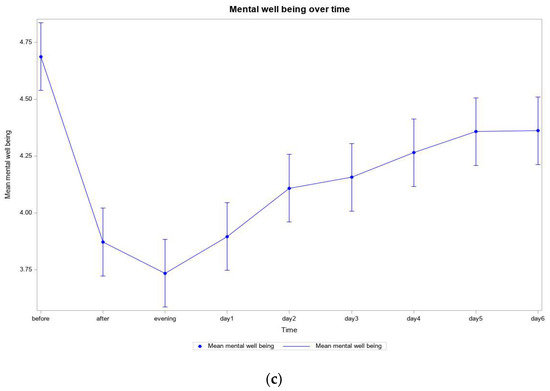 (a) Physical well-being of all participants over time (N = 51); (b) Psychological well-being of all participants over time (N = 51); (c) Mental well-being of all participants over time (N = 51).
