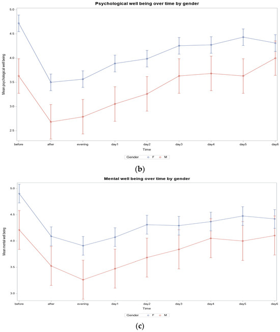 (a) Physical well-being over time by sex (N = 43, Women = 34, Men = 9; (b) Psychological well-being over time by sex (N = 43, Women = 34, Men = 9; (c) Mental well-being over time by sex (N = 43, Women = 34, Men = 9).