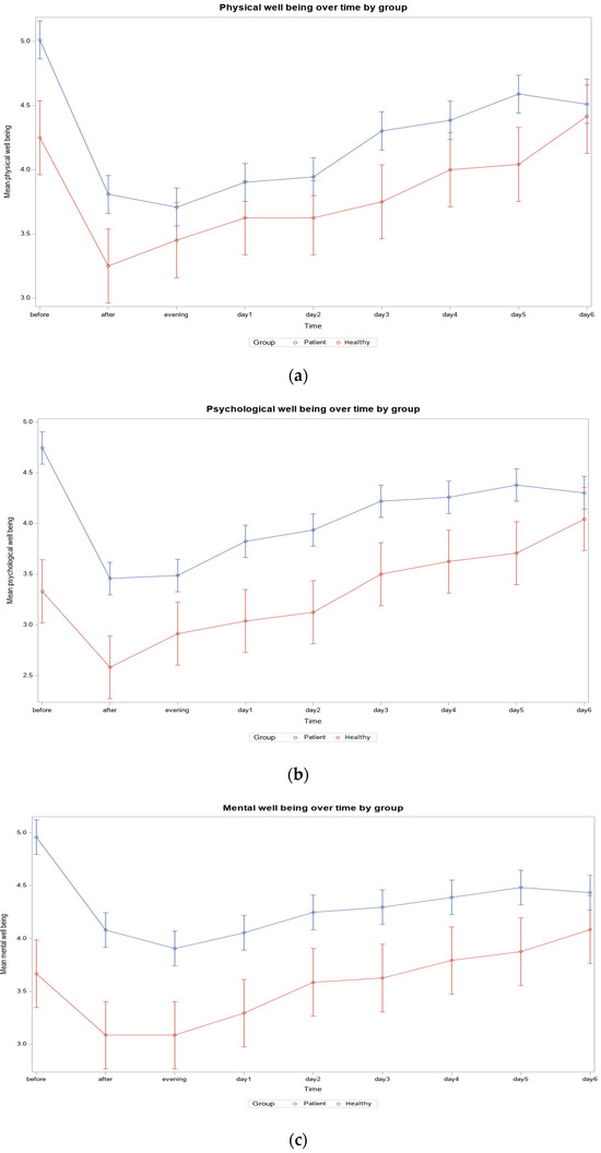 (a) Physical well-being over time: Patient vs. Healthy Partner (N = 50, patient = 38, healthy = 12); (b) Psychological well-being over time: Patient vs. Healthy Partner (N = 50, patient = 38, healthy = 12); (c) Mental well-being over time: Patient vs. Healthy Partner (N = 50, patient = 38, healthy = 12).