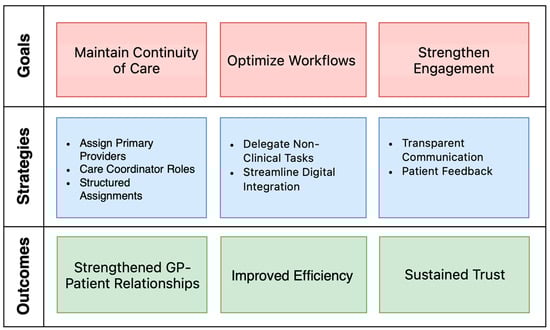 To preserve continuity of care and trust in South Tyrol’s primary healthcare system during the transition to team-based care models, a set of strategic actions is essential. These strategies focus on maintaining strong GP–patient relationships, reducing administrative burdens, and fostering engagement with both patients and healthcare providers (Figure 2). The following section outlines these strategies, organized by overarching goals and their corresponding outcomes, to ensure an effective and patient-centered reform process. To enhance the methodological rigor of this study, the i-PARIHS framework is adopted to structure the proposed strategies [32]. I-PARIHS emphasizes that successful implementation depends on the interaction between the innovation (Ministerial Decree 77/2022 and its shift to team-based primary care), the recipients (GPs, healthcare professionals, and patients in South Tyrol), the context (South Tyrol’s bilingual, rural, and culturally distinct healthcare landscape), and facilitation (measures to support engagement and minimize disruption). By applying this framework, the recommendations are designed to enhance stakeholder readiness, maintain continuity of care, and optimize integration within the region’s healthcare system. This structured approach ensures that the transition to multidisciplinary primary care remains evidence-based, sustainable, and aligned with local needs.