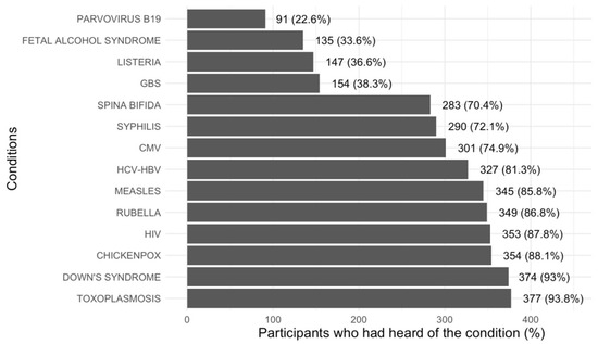 Figure 1 shows women’s general awareness of various conditions relevant to gestation. Overall, 377 (93.8%) women were aware of the existence of toxoplasmosis, making it the most commonly recognized condition.