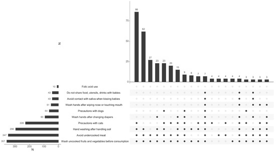Women’s knowledge of specific hygiene measures to avoid acquisition of TG infection in pregnancy; N: number. The questionnaire allowed women to give one or more answers. The last four listed behaviors are those specific for preventing TG infection acquisition. The vertical bars identify the number of women who chose the combination of answers marked with the black dots underneath. The figure shows the combination of answers chosen by at least three women. The horizontal bars identify the total number of women who gave the specific answer reported.