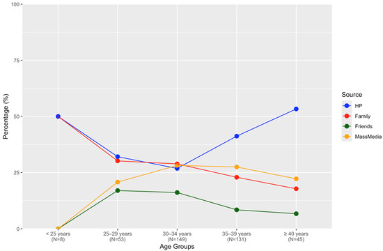 The spaghetti plot (Figure 3) illustrates the relationship between sources of information used by participants before conception and women’s age. Up to the age of 30–34 years, healthcare providers and family members were the primary sources. However, after this age range, the influence of family members declined gradually, whereas healthcare providers remained predominant. Interestingly, mass-media usage increased until age 35 and then stabilized.