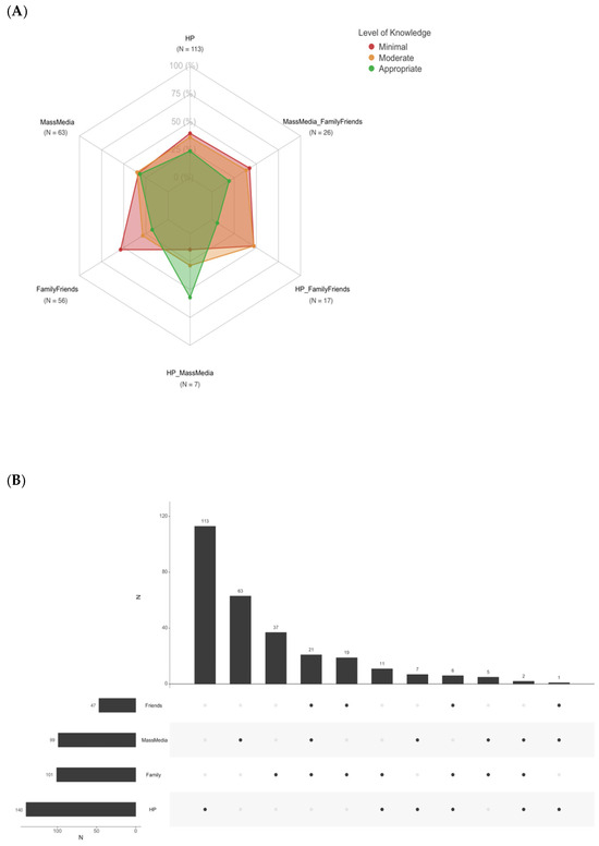 Figure 4A,B display the relationship between sources of information, both individually and in various combinations, adopted by TG-aware women before conception and their level of knowledge about specific hygiene measures. Women who primarily received information from healthcare providers and mass media demonstrated a higher level of knowledge (depicted in green); conversely, reliance on family and friends was associated with minimal knowledge (depicted in red) (Figure 4A).